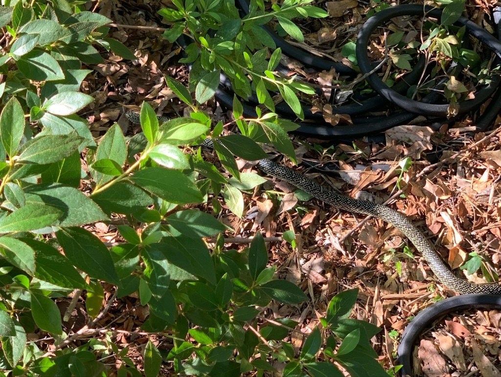 Yes, my maid prefers to drink wine and watch Netflix, but she finally broke down and cleaned the house. And yes, I am the maid. I’m also the flower bed gardener. And once again, I’ve been preferring to drink wine and watch Netflix, but this has been going on too long, specifically azaleas growing taller than my 5’8″ self, too long. So the last couple of days, I got out there and just chopped and chopped. I made a huge pile of clippings. Sorry, neighbors. The tops of my forearms are soar, but the azaleas are now waist high and it looks like people actually reside at my house instead of it being vacant with overgrown bushes. And I’m definitely done for a while, as not fifteen minutes after I picked up my last big pile of debris beside the water hose, here slithers up a yard long speckled black snake. Now before you tell me how good speckled black snakes are, I need to remind you that: a. I was just bending down grubbing my bare hands under piles of leaves and sticks right there. b. I was wearing shorts and sandals. c. I’m terrified of snakes, even the good ones. Soooo…seriously done out in the azaleas. They might be higher than the house, unless Mr. Snake moves along.