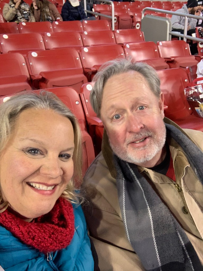 It was cold!!!! SOOOO Very Cold! I wore leg warmers that my mom had kept from the 1980’s! And I was so thankful for those leg warmers! I want to bring them back they felt so warm and cozy. Rudy and I took our hats and scarfs and all our gear off for this quick photo; it was cold! But we had fun. Just like every game! We went to every home game, except one this season. And we had a great time! GO HOGS! Also, this weekend, they had the lights out on the Fayetteville square. Now, we learned a valuable lesson to go ahead and walk a little further and not get the hot cocoa at the first booth as they will require a 30 minute wait to warm up a 5 gallon pot on a tiny single burner camp stove after already taking your money in the frigid temps. But really it just made for something for us to talk about…hahaha. And the lights were really lovely. If you ever get a chance go see them.